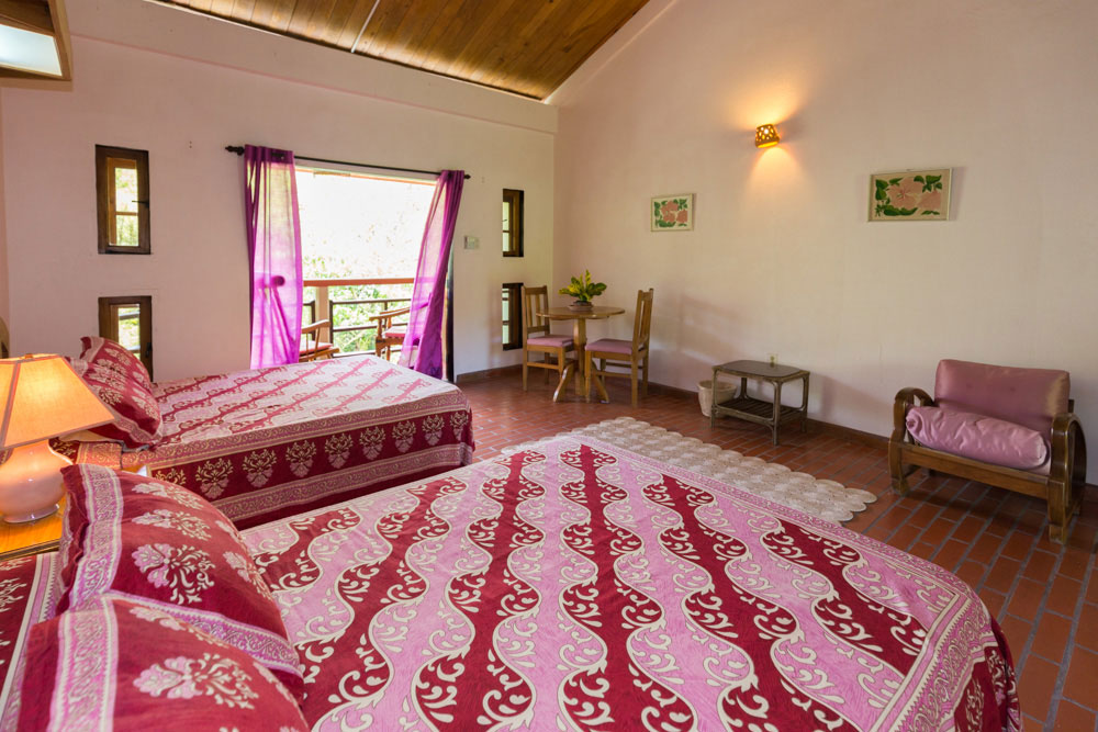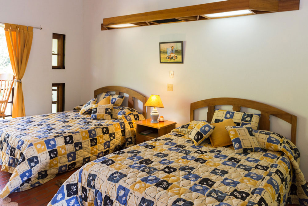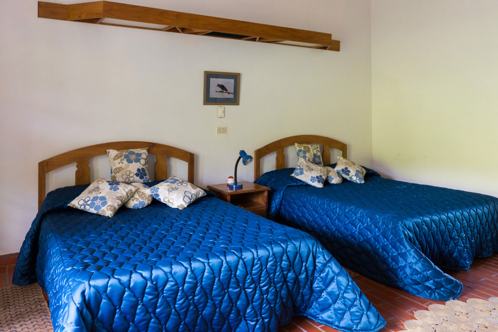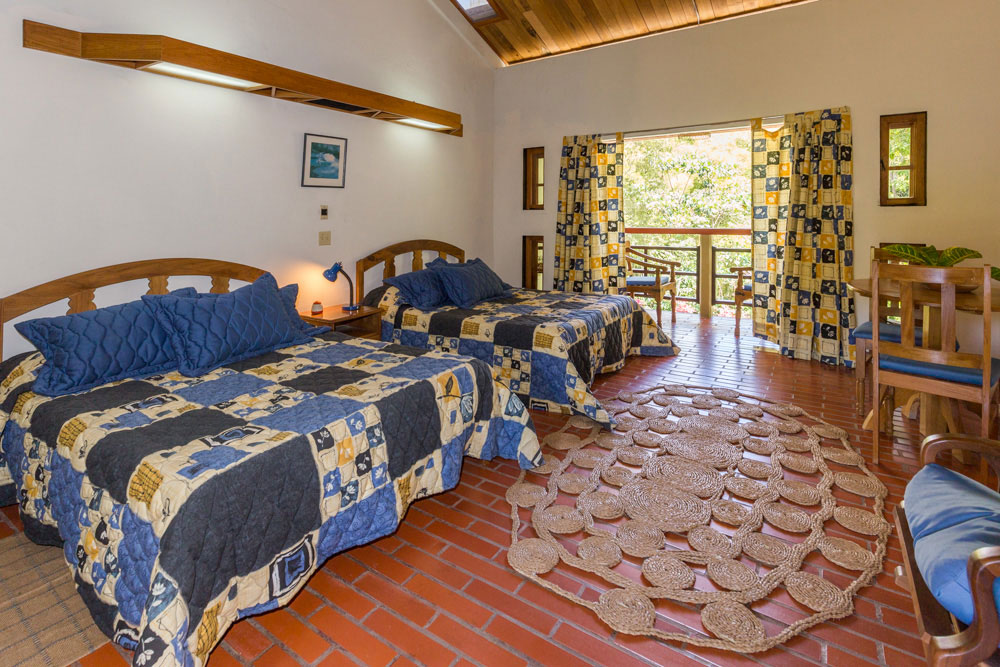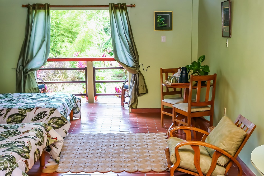 Each Deluxe room features an ensuite bathroom with a grab bar and solar-heated shower, two double beds, and convenient tea and coffee-making facilities. Accessibility is a priority, with wheelchair-friendly ground floor rooms and ramps leading into the hotel and up to the pool deck. Enjoy a private balcony in every room, providing stunning views of the rainforest and our main bird-feeding area. Immerse yourself in the perfect blend of adventure and relaxation at our welcoming retreat.